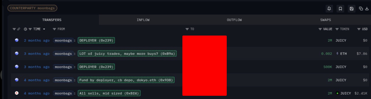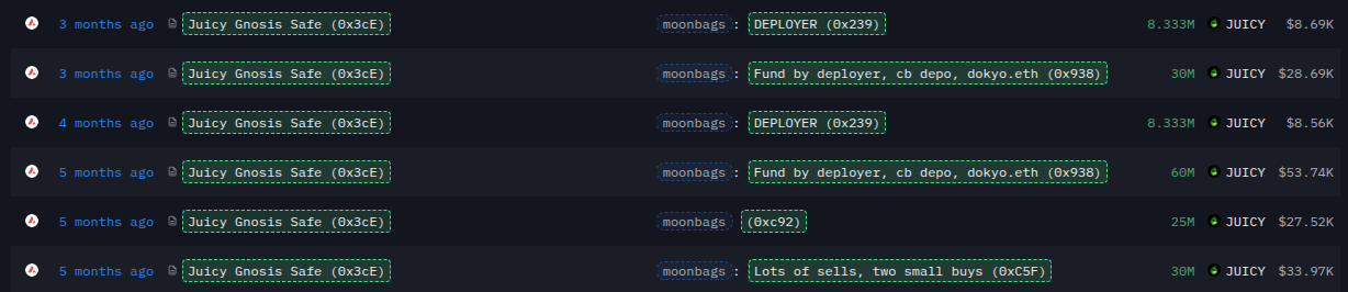 Here we’ve got these accounts that are receiving funds directly from the Juicy Gnosis Safe. This isn’t perfect evidence of ownership but it does indicate intent, since the TX had to be signed by someone important!